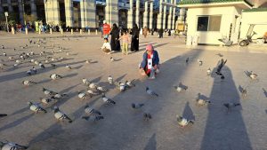 Usai salat di Masjid Nabawi, kota Madinah yang indah. Ibu mengajak aku jalan-jalan melihat merpati berwarna biru laut, mengepakkan sayapnyaa, kami pun membeli makanan untuknya.